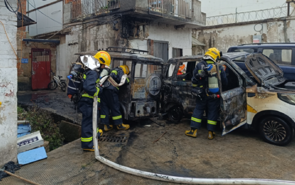 為避免火勢進一步蔓延,消防員立即使用水槍展開撲救,經過處置,火勢被成功撲滅,但兩輛車均被燒毀。